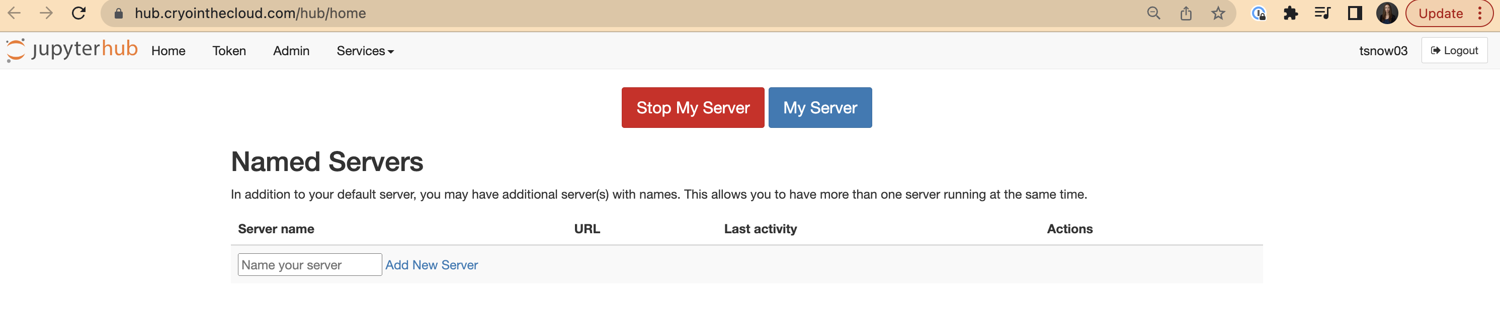 Whenever you are done, it is best to shut down your server when you sign out to save on money for CryoCloud. Time on the JupyterHub costs money and there are systems in place to make sure your server doesn’t run indefinitely if you forget about it. After 90 minutes of no use, it will shut down. We prefer you shut down the server when so we save that 90 minutes of computing cost. To do so: